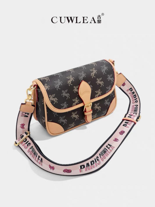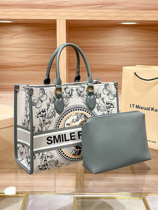 Shoulder Bag - Embroidered Pattern - Light Blue Trim